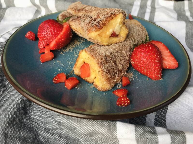 Smeer ongeveer 1-2 theelepels roomkaas met stukjes aardbei op het uiteinde van het brood in een lijn. Rol het brood stevig op en herhaal met het andere broodje. Ik hou echt van roomkaas met in blokjes gesneden aardbeien als combinatie maar je kan natuurlijk in plaats van roomkaas ook chocoladepasta doen of wat anders wat je maar lekker vindt.