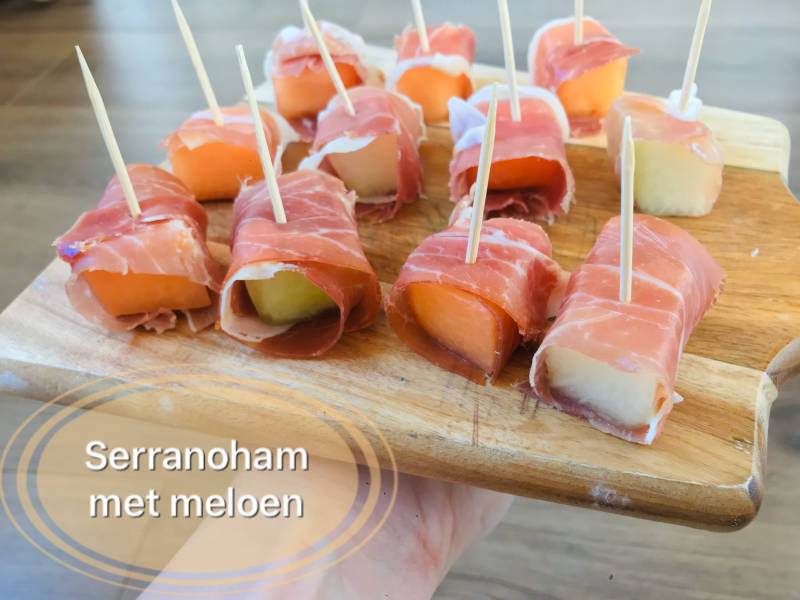 3. Wikkel elk blokje meloen in een plakje ham en steek er een prikker in.